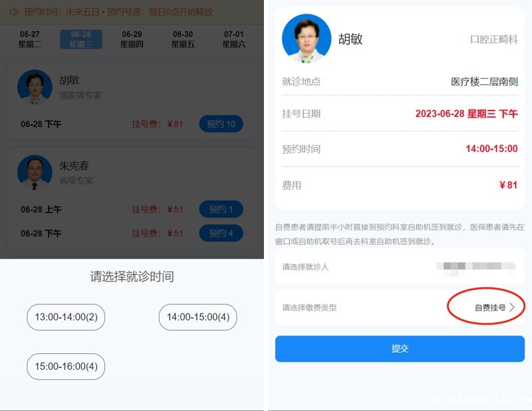 在“首页”中点击“预约挂号”,选择“院区”,选择需要预约挂号科室,选择“预约日期”,根据日期可查看到医生出班情况以及剩余号源数,选择“预约时间段”,在挂号确认界面选择缴费类型“自费挂号”“医保挂号”,自费挂号预约患者无需现场取号,医保预约患者需当日就诊前携带身份证或医保卡来院通过窗口或自助机进行取号。完成后提交即可。