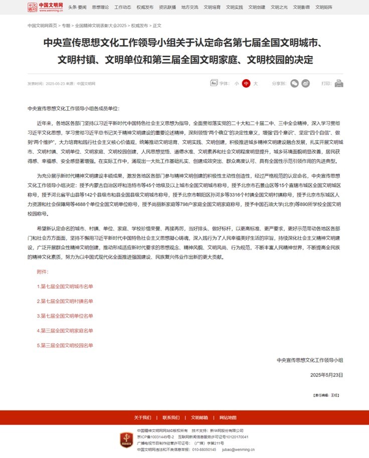 2025年5月,中央宣传思想文化工作领导小组在中国文明网发布《中央宣传思想文化工作领导小组关于认定命名第七届全国文明城市、文明村镇、文明单位和第三届全国文明家庭、文明校园的决定》,我院荣膺第七届“全国文明单位”称号!